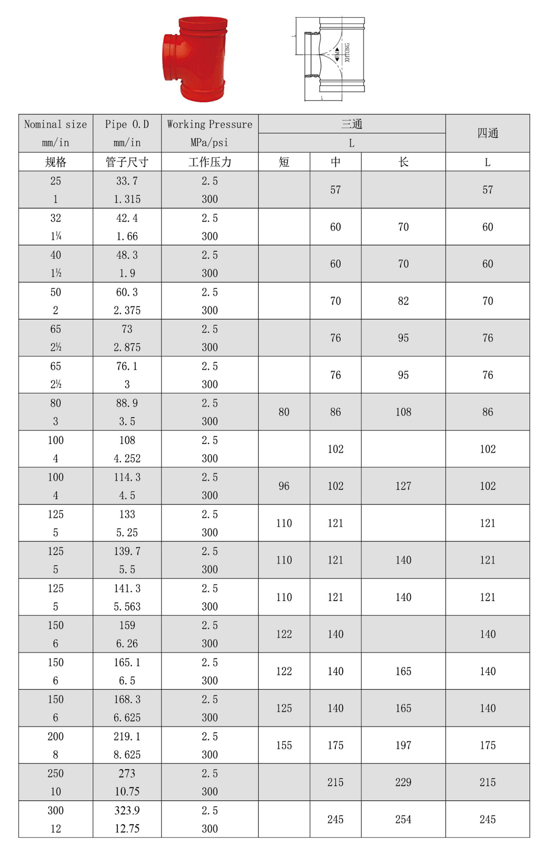 正三通(消防红)为管件、管道连接件。又叫管件三通或者三通管件,三通接头,用在主管道要分支管处。三通是具有三个口子,即一个进口,两个出口;或两个进口,一个出口的一种化工管件,有T形与Y形,有等径管口,也有异径管口,用于三条相同或不同管路汇集处。三通的主要作用是改变流体方向的。